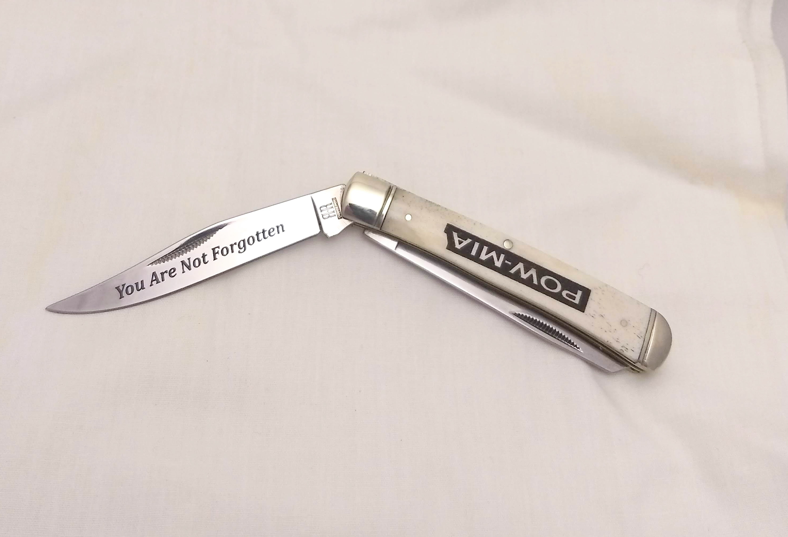 POW-MIA artwork laser engraved on smooth bone handle. “You are not forgotten” laser etched on clip point blade. Customized text can be laser etched on spey blade.